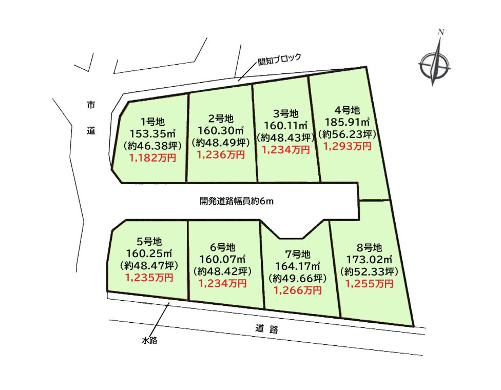 ※開発許可番号:7知建第59-13号 ※開発造成の検査済発行後の引渡し ※道路は開発造成後知多市へ移管する ※区画①水道負担金62,000円、区画②~⑧水道負担金122,500が必要となります。 |